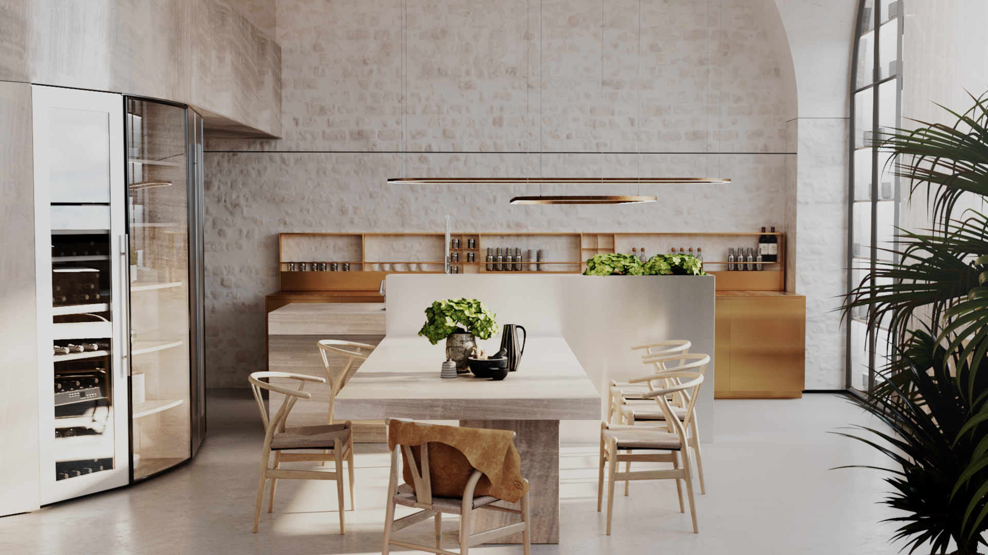 Жилое пространство формируется за счет возведения в нем трех функциональных каменных объемов из мрамора светлого оттенка. Они словно прорезают основное пространство от пола до потолка. За счет использования стеклянных перегородок объемы теряют свою монументальность у верхних точек, что позволяет полностью видеть старинную сводчатую кладку. Торжественность обстановке добавляет каменная лестница, парящая над светлым деревянным полом.
